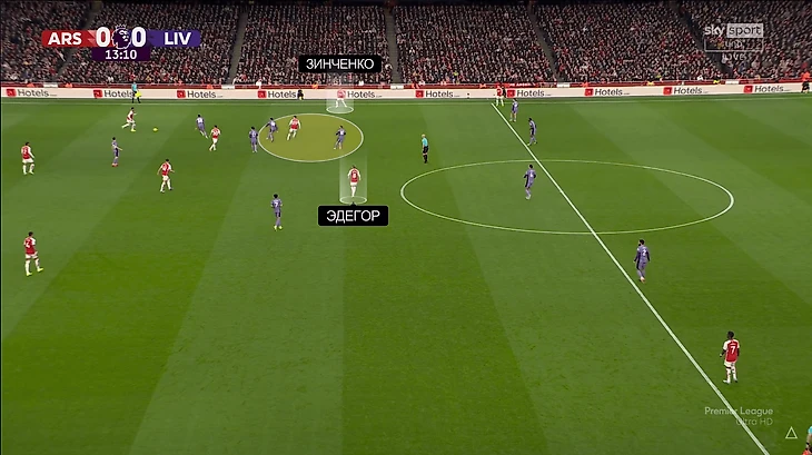 После нескольких передач удалось доставить до Хавертца, на которого одновременно вылетели Мак Аллистер и Гакпо. Это запустило цепную реакцию – свободными оказались Александр Зинченко на фланге и Эдегор в опорной: