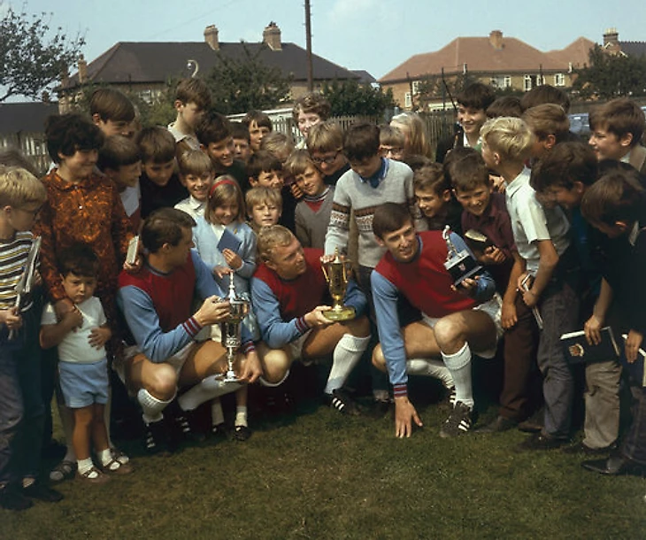 Юные болельщики «Вест Хэма» дождались своих героев, а им в свою очередь есть, что показать болельщикам. Херст держит в руках свой приз лучшему игроку Чемпионата Мира по версии газеты News of The World. Мур держит в руках недавно полученную награду лучшему игроку Чемпионата Мира. В руках у Питерса награда Мура за 1964 год, 16 августа 1966 года.