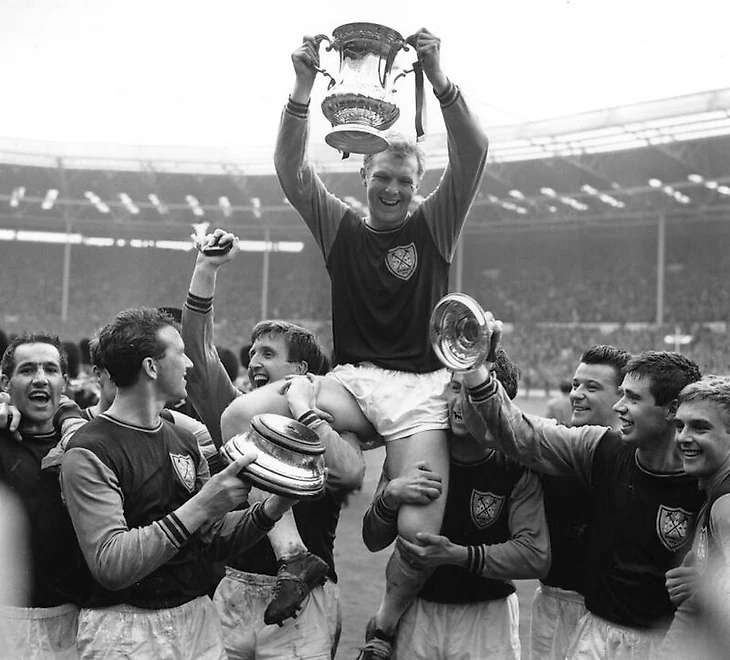 Качают своего капитана на «Аптон Парке», впереди финал Кубка Англии, 17 апреля 1964 года.