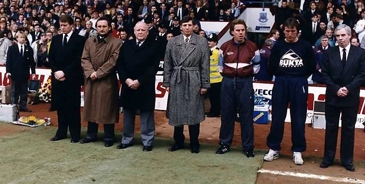 6 марта 1993 года. Джефф Херст, Фрэнк Лэмпард старший, Рон Гринвуд, Мартин Питерс, Харри Реднапп, Билли Бондс и Ронни Бойс. Футболку из цветов выносили Херст и Питерс.