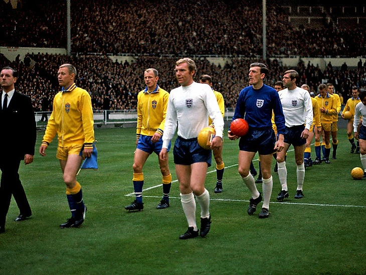 Товарищеская игра, Англия 3-1 Швеция. Это фото примечательно еще тем, что это первая и последняя игра вратаря Алекса Степни (на тот момент основного вратаря МЮ) за сборную, через 7 дней ему предстоит игра против «Бенфики» в финале Кубка европейских Чемпионов , 22 мая 1968 года.
