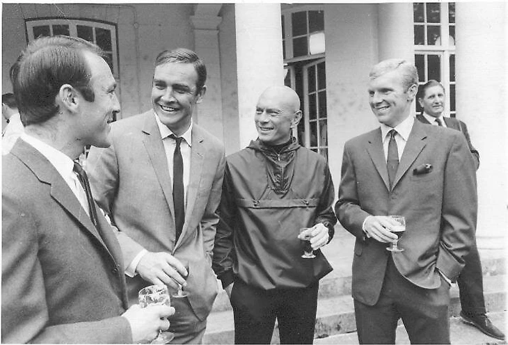 Все там же на киностудии. Джимми Гривз, Шон Коннери (да-да, тот самый, который играл Джеймса Бонда) и Юл Бриннер (актер, его выдернули прямо со съемок), 1966 год.