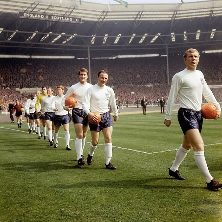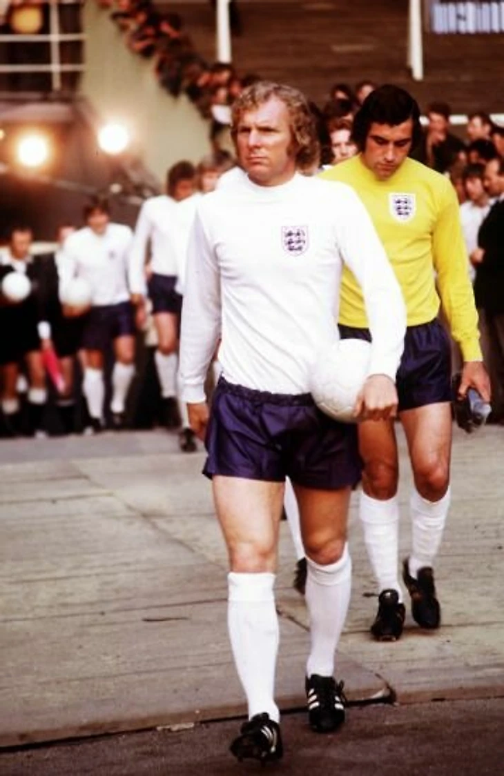 Все посторонние мысли оставил в подтрибунном помещении. Выводит Англию на игру Британского Чемпионата против Уэльса. Англия победила 3-0, 15 мая 1973 года.