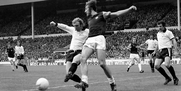 «Уэмбли», финал Кубка Англии 1975 года. «Вест Хэм» – «Фулхем». Мур в единоборстве с новым капитаном «Вест Хэма» Билли Бондсом, 3 мая 1975 года.