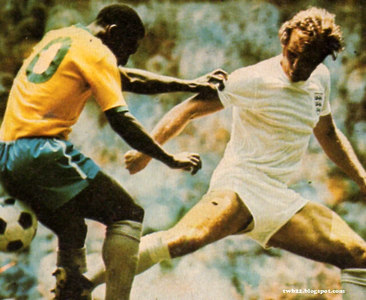 Первая знаменитая фотография с матча. Одна из самых красивых игр за всю историю мировых чемпионатов. Матч запомнился несколькими вещами: монументальной, сверхнадежной и корректной игрой Мура, не допустившего по отношению к Пеле ни единой грубости; невероятным сэйвом Гордона Бэнкса; попаданием Аланa Болла в перекладину за две минуты до конца. Бразилия 1-0 Англия, Пеле так и не удалось отличиться (тот самый сэйв Бэнкса), отличился Жиарзиньо.