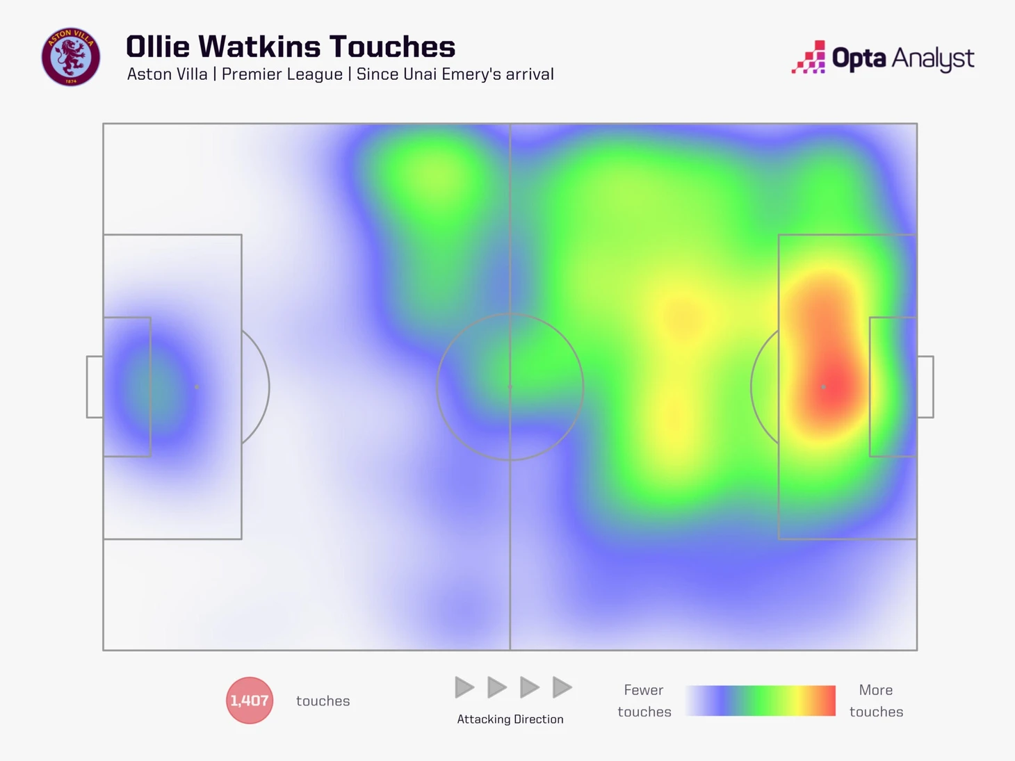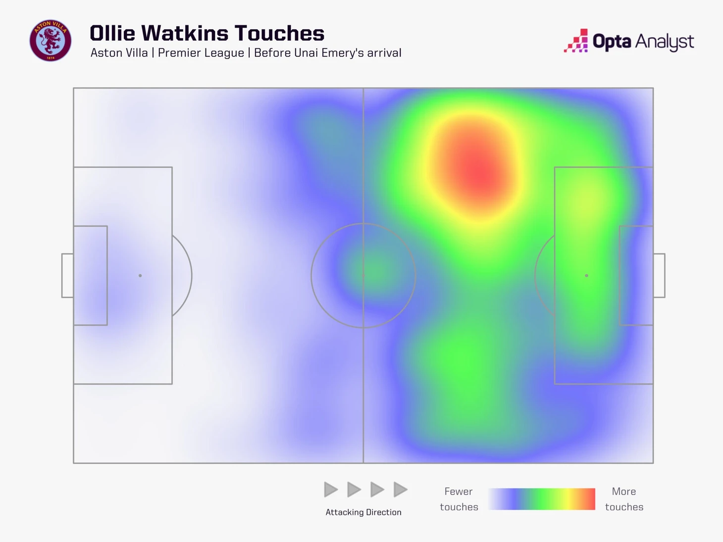 Сравнение тепловых карт фиксирует эволюцию. Вот так Уоткинс двигался при Стивене Джеррарде – яркое пятно у левого фланга: