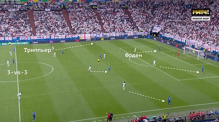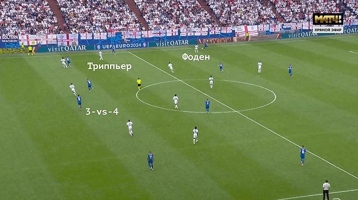 Англия выбрала структуру с персональными ориентировками. Вероятная цель – ограничить тройку полузащитников Словакии, которая блестяще подкована в аспекте. Ключевой была роль у Фодена и Триппьера. Фил выдвигался на одну линию с Харри Кейном, Киран – компенсировал его движение и поднимался высоко по флангу.