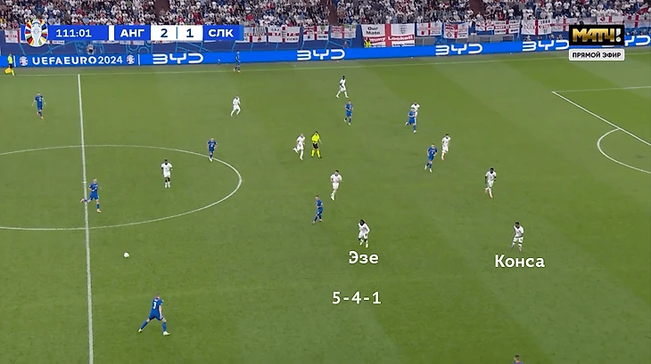 Основное время Англия доигрывала шестеркой атакующих игроков. Одновременно на поле находились Кейн, Тоуни, Палмер, Эзе, Беллингем и Сака. К тому моменту Букайо уже 20 минут играл левого защитника (есть опыт в «Арсенале»), но после быстрого второго гола Саутгейту пришлось решать, как всех разместить.