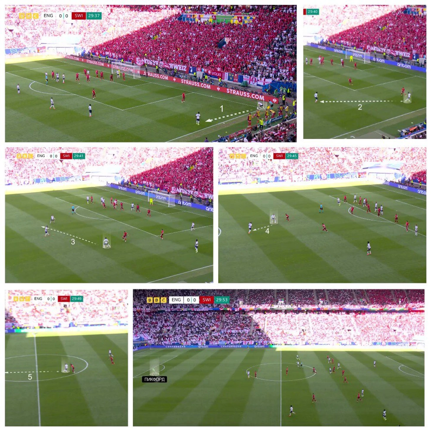 Легендарный угловой в матче против Швейцарии. Раз, два, три, четыре, пять – и мяч уже у Пикфорда: