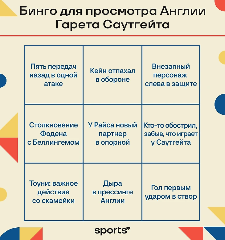 Осторожный стиль Саутгейта и пыточные сценарии матчей против заведомо более слабых соперников не делают этот процесс приятнее. Нужно хитрить. Один из способов справиться со скукой (и стрессом, если вы болельщик Англии) – заполнение Саутгейт-бинго.
