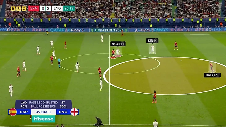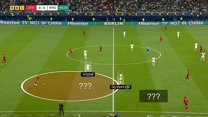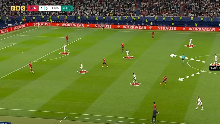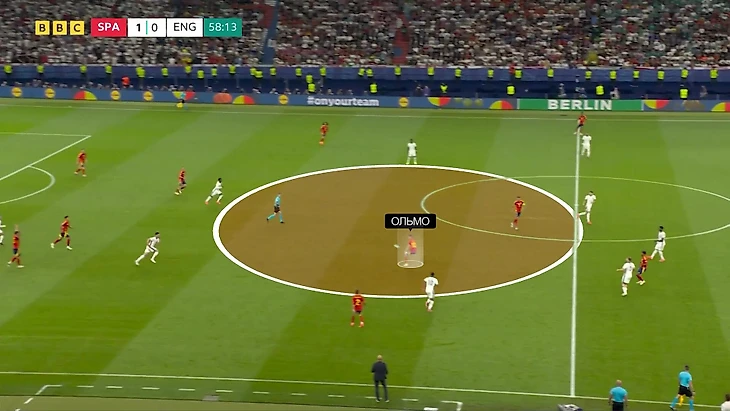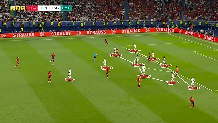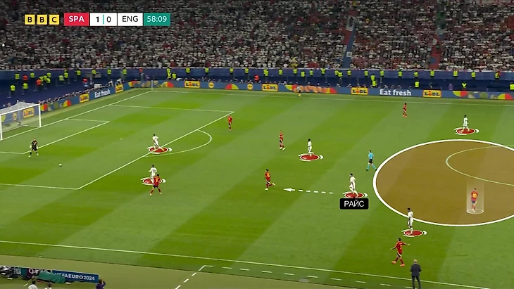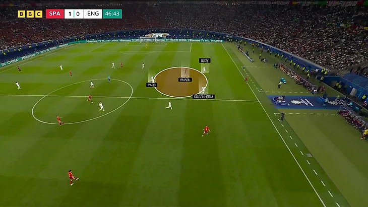 Отрезок при 1:1 – Испания снова атакует, но теперь против очень раскрытого состава англичан. При явной пассивности Англии моменты были почти неизбежны. До гола Микеля Ойарсабаля был явный шанс у Ламина Ямаля.