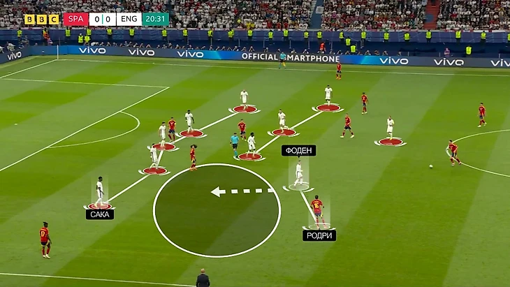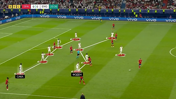 Но были моменты, когда Фодену приходилось идти за Родри во фланговые зоны. Фил дисциплинированно следовал за испанским опорником, а у Англии запускалось перестроение. Когда Фоден добирался до зоны правого полузащитника, Сака освобождал Филу зону и образовывал пятерку сзади: