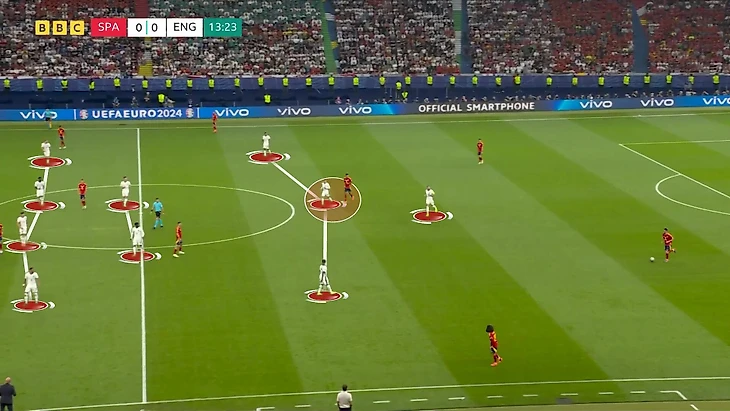 4. Ключевая стадия первой половины – владение Испании против английской обороны. Два главных акцента от Саутгейта – низкий блок без прессинга и перекрытие развития атак через Родри.