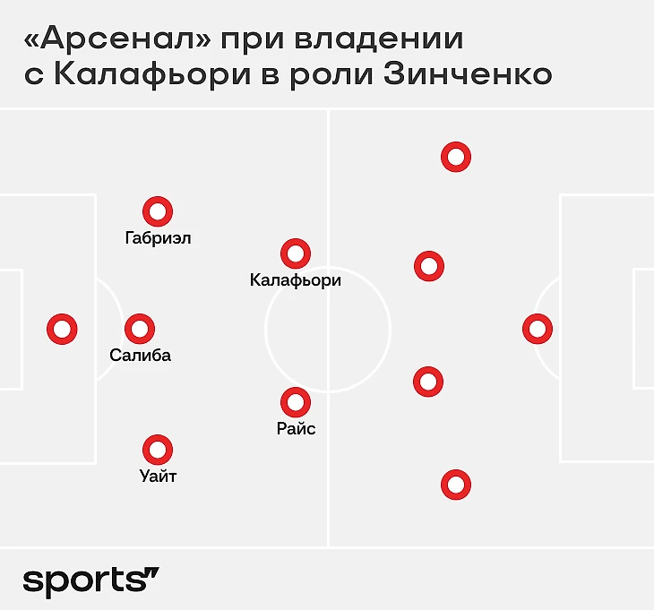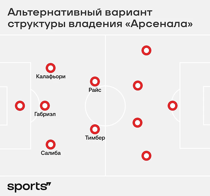 Основной вариант использования Калафьори – ложный фулбек слева. Но он также будет первым вариантом на подмену в случае травм в основной связке центральных защитников. А еще может играть левого центрального защитника при владении, если Артета захочет в конкретном матче сделать ложным правый фланг. Может выглядеть примерно так: