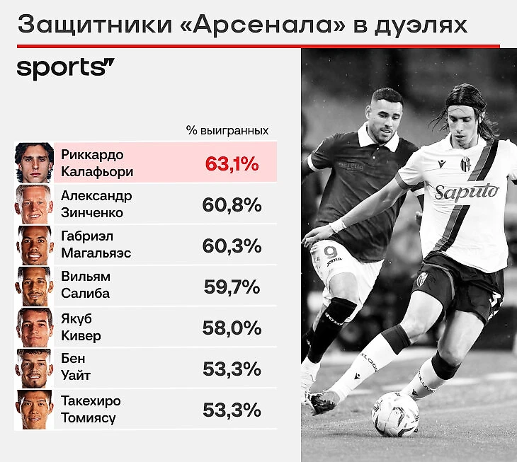 Дуэли – спорный показатель, так как включает много очень разных по типологии эпизодов. Он дает только примерную картину. У игрока может быть хороший общий показатель, но провал в одном конкретном аспекте, который все будут использовать. Это не случай Калафьори – он очень умело обороняется. Но есть нюанс: выше статистика в роли центрального защитника, а в «Арсенале» чаще придется играть на фланге.