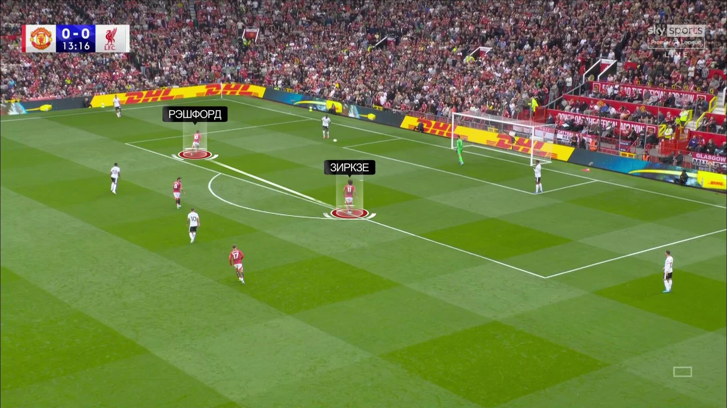 При прессинге на чужой трети команды опирались на персональные ориентировки. Дальний фланг оставался свободным, вингер и нападающий начинали давление. Вот пример от «МЮ» – первую волну дают нападающий Джошуа Зиркзе и вингер Маркус Рэшфорд: