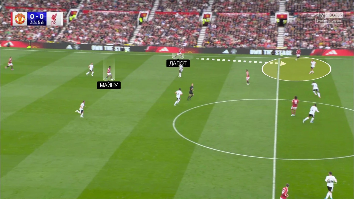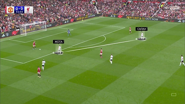 У «МЮ» с этим проблемы. Даже сохраняя мяч в первой стадии, они продолжали пасовать через насыщенную зону. Более того, «Ливерпуль» пугающе часто оставлял свободным не условный фланг, а именно фланг Диогу Далота: