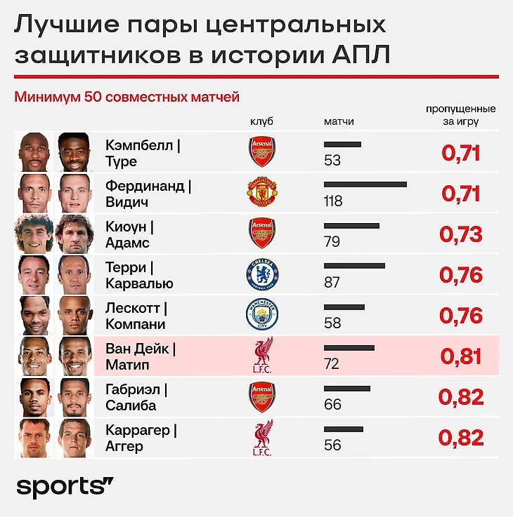 Важно учитывать этот аспект при взгляде на таблицу, хотя даже без деталей позиция ливерпульской связки крайне высокая. Еще один мощный факт: с парой Матип-Ван Дейк в составе «Ливерпуль» собирал в среднем 2,39 очка за игру (91 очко в переводе на дистанцию сезона). То есть одного их присутствия хватало, чтобы команда выглядела как претендент на чемпионство – вне зависимости от других факторов (травмы вокруг, текущая форма, уровень соперника, контекст сезона и т.д.).