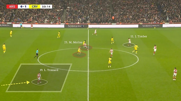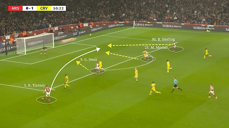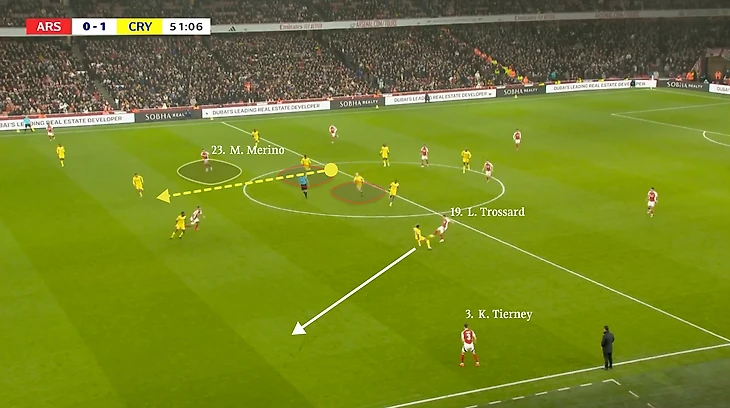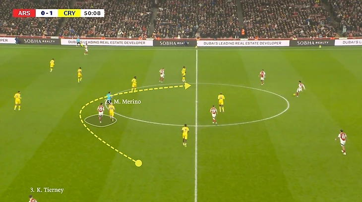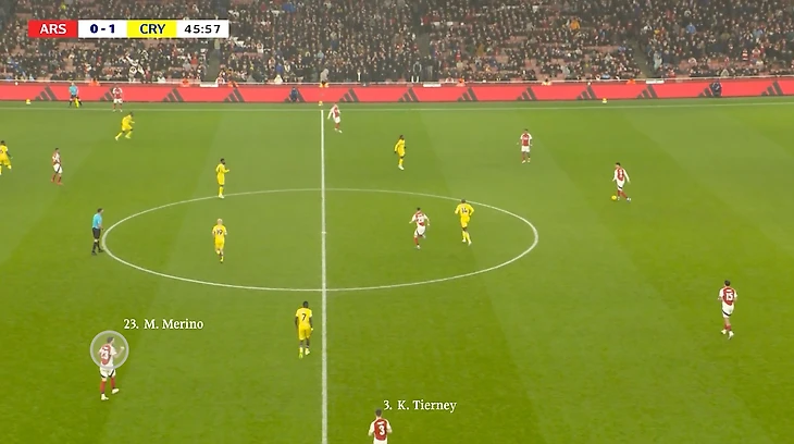 Жест Мерино как наставление для Тирни занимать более высокую позицию – мелкая, еле заметная деталь, ставшая предвестником первого голевого момента у ворот «Кристал Пэлас». В течение следующих 4-5 минут, все усилия команды Микеля Артеты в билд-апе сводились к тому, чтобы вывести Тирни на пространство.