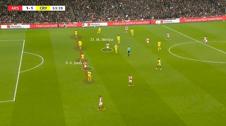Именно Мерино выступил теневым героем потрясающей атаки, после которой Габи Жезус сравнял счет против «Пэлас». Основная заслуга ушла Мартину Эдегору, отдавшего шикарный разрезающий пас. Эту возможность для паса создал именно Мерино.