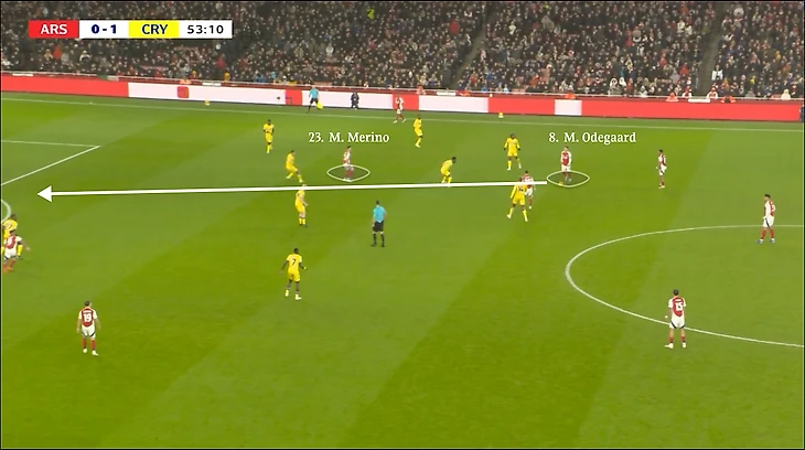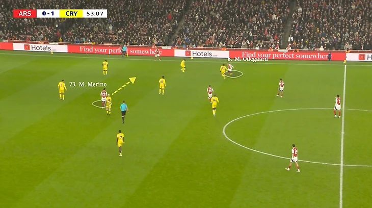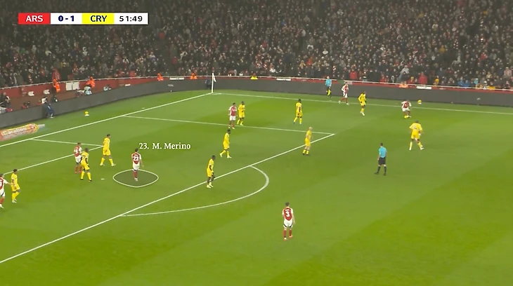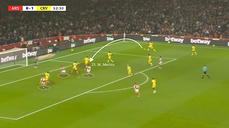 «Кристал Пэлас» компактно оборонялся на своей половине, не предоставляя «канонирам» явных вариантов для продвижения. С ног на голову ситуацию переворачивает Мерино, сместившийся в правый полуфланг – зону, которую обычно занимает Эдегор.
