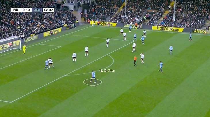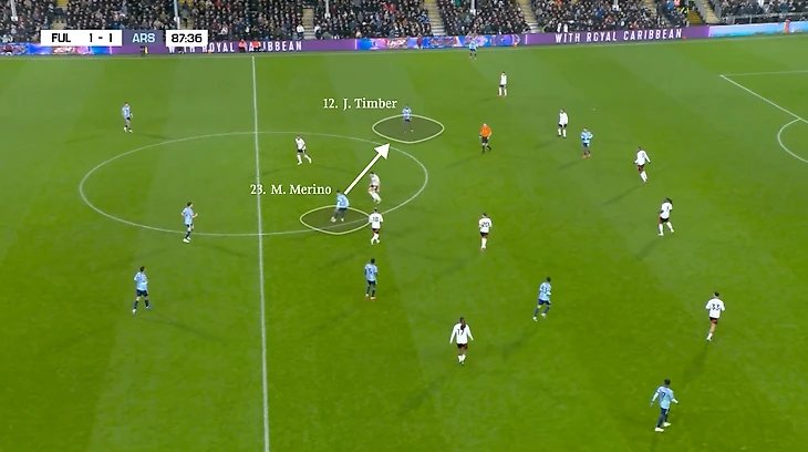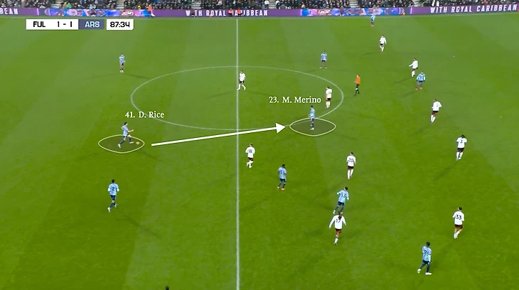 Другой яркий пример из второго тайма против «Фулхэма». Выйдя на замену, Мерино постоянно менялся позициями с Габи Жезусом, становясь то полузащитником, то ложной девяткой. Сначала Мерино опускается к центральному кругу, чтобы получить мяч от Райса, а затем быстро перенаправить атаку в левый полуфланг.