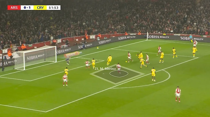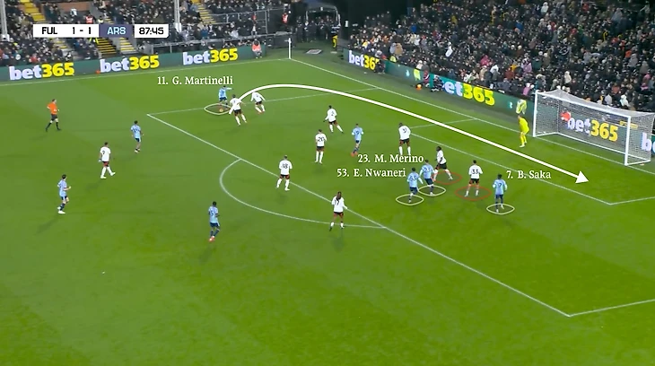 Спустя 10 секунд Мерино уже готов откликнуться на подачу в штрафной. Вместе с Сака и Нванери они создают численное преимущество 3х2 на дальней штанге, куда и последовала подача. Эпизод закончился незасчитанным голом из-за офсайда у Мартинелли.