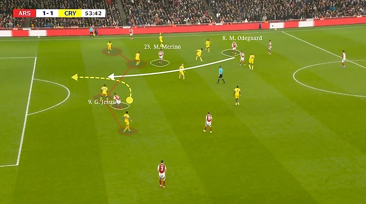 Самое большое различие между Мерино и Райсом заключается в том, как они двигаются, когда команда владеет мячом, и как быстро принимают решения. Вот пример похожей атаки «Арсенала» против «Кристал Пэлас»: Мерино и Габи Жезус сковали двух игроков в центре, а это значит, что у игроков на фланге будет больше пространства для удачного перепаса – если кто-то из центральных защитников выдернется с позиции, то второму придется обороняться сразу против двух игроков «Арсенала». При этом каждый из них остается потенциальным адресатом для навеса.