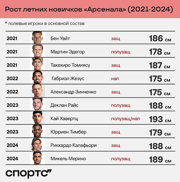 После подписания Деклана Райса в 2023-м тренер «Арсенала» подчеркнул: «Он обладает физическими качествами, которых нам долго не хватало. Потому он здесь». А про 193-сантиметрового Кая Хавертца Артета сказал так: «Мы получили что-то совершенно новое с его мастерством и ростом».