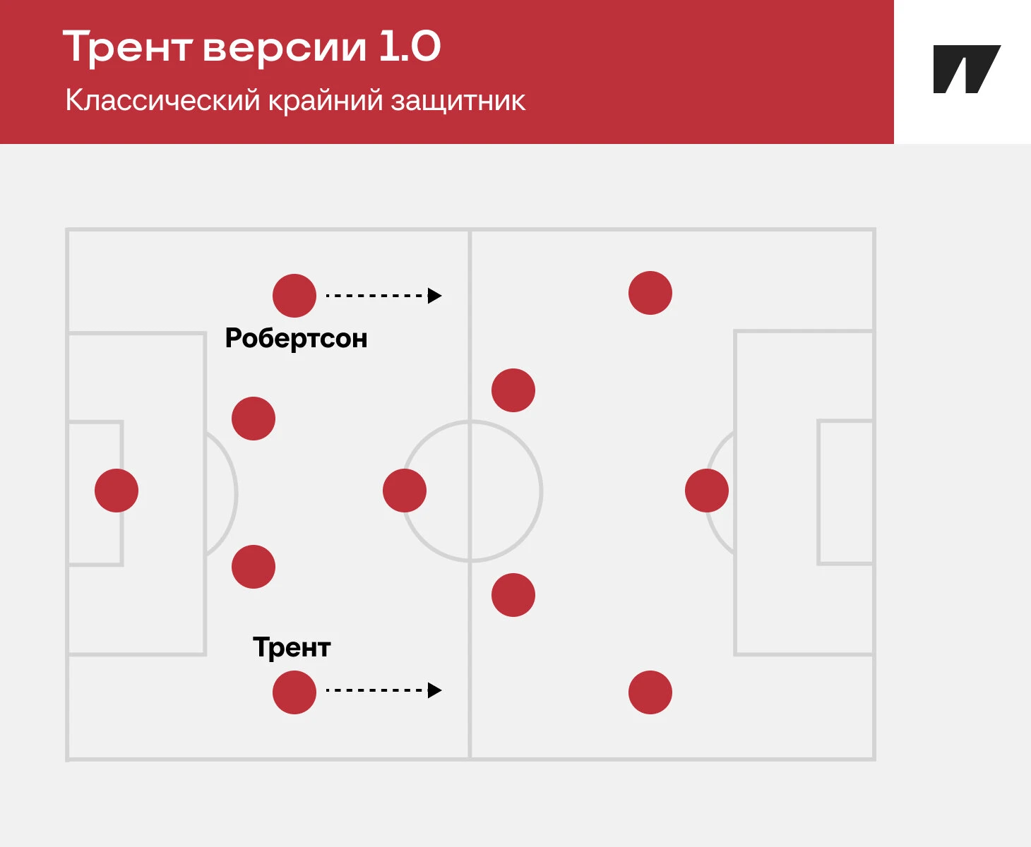 Трент версии 1.0 – классический крайний защитник с кроссами в качестве главного инструмента. Именно в этой роли ТАА ворвался в команду. В пиковой версии закрепился как главный наследник Кафу. Бразилец подыгрывал, подмечая общие черты. Самое явное сходство – своевременность и частота врываний по флангу. В аналогичной роли, но на противоположном краю блистал Энди Робертсон. Такой формат крайних защитников предпочитал Юрген Клопп на первых порах. Ассистент Пеп Лейндерс говорил, что мечтает о голе, организованном парой фулбеков (один прострелит – другой завершит).