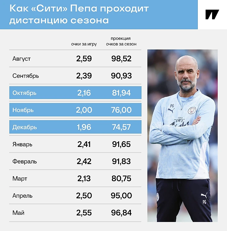 В словах Пепа выделяются два акцента. Во-первых, непонимание, как на команде отразится скомканная предсезонка. Во-вторых, упор на то, что если и ждать спада, то в конце осени – начале зимы. Отсечка подобрана неслучайно – именно на этот отрезок у «Сити», как правило, приходится основной спад.