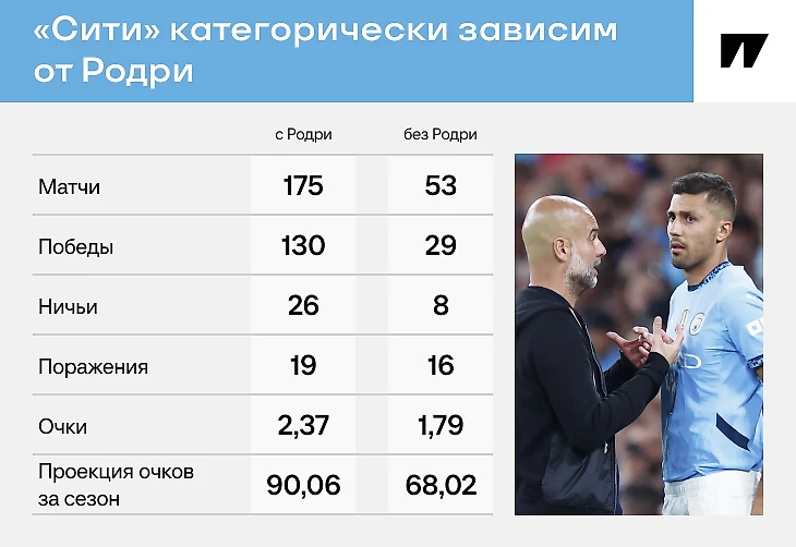 Вот характерная табличка с результатами «Сити» с Родри и без него. Команда с Родри – безоговорочный чемпионский проект. Та, что без Родри – максимум претендент на финиш в зоне ЛЧ. Между ними – натурально пропасть.