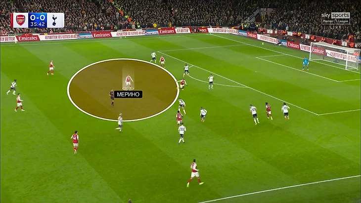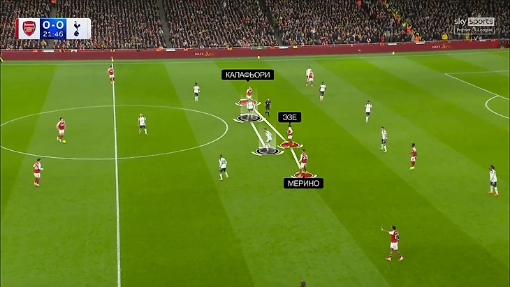 Команда Артеты терпеливо душила соперника и закономерно дожала. Ключевой зоно вскрытия стала опорной «Тоттенхэма». Структура «Арсенала» при владении подразумевала три свободные десятки. Ими выступали Риккардо Калафьори, Эберечи Эзе и Микель Мерино: