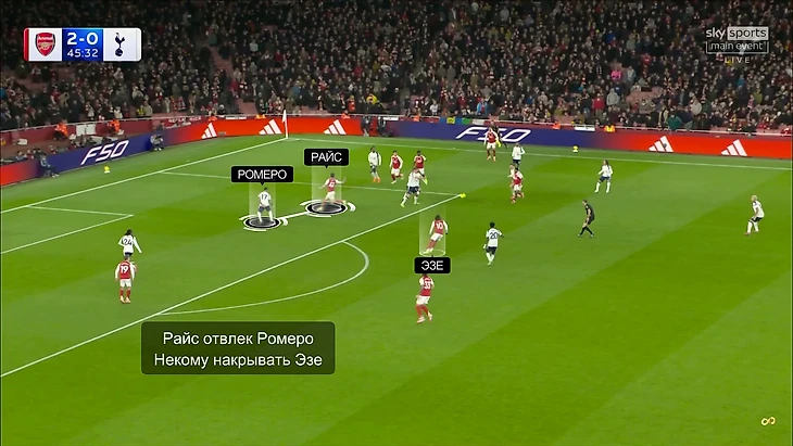 Первый тревожный сигнал прозвучал на старте, когда убойный момент после паса из опорной получил Деклан Райс. Дальше последовало наказание. «Шпоры» большой группой встречают на левом фланге. Не только не отбирают, но и позволяют доставить в уязвимую зону. Там уже караулят Эберечи Эзе и Микель Мерино.