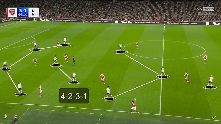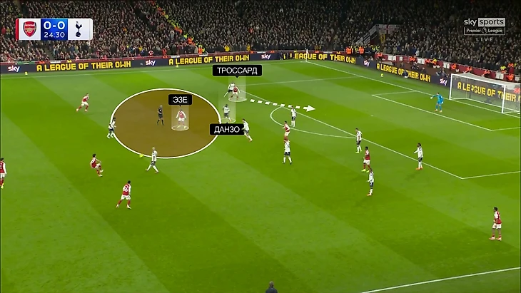 Ожидаемо не потянули такой объем. Для тушения пожаров была необходима помощь центральных защитников. И тут сразу ряд проблем. Во-первых, в рамках 5-4-1 эти механизмы у «Тоттенхэма» не очень отлажены – возникали банальные ошибки координации. Во-вторых, такие выдвижения открывали дыры в линии защиты, куда можно было врываться – чаще всего ими пользовались Деклан Райс и Леандро Троссард: