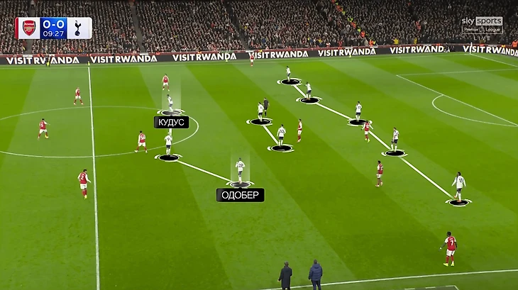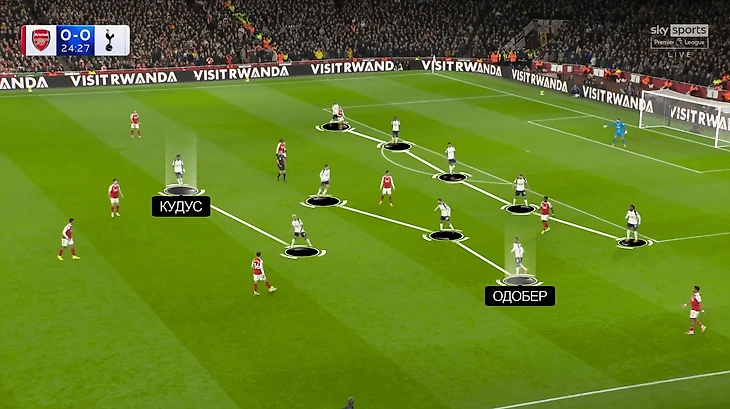 Вероятно, держали в уме силу правого фланга «Арсенала». Это главное направление у команды Артеты даже в отсутствие Мартина Эдегора. Его «шпоры» старались перекрыть всеми силами – не только при помощи Одобера, но и постоянных смещений опорных. Левый фланг специально игнорировали. Кудус не поддерживал компактность и караулил редкие шансы для контратак.