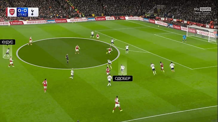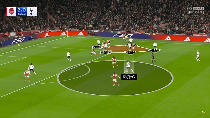 Обе ставки провалились. Кудус вообще не получил моментов на пространстве. А «Тоттенхэм» хоть и подавлял прямую угрозу от Букайо Саки, не обрывал ее на корню. «Арсеналу» удавалось регулярно доставлять мяч в зону, которую оставлял Кудус в защите.