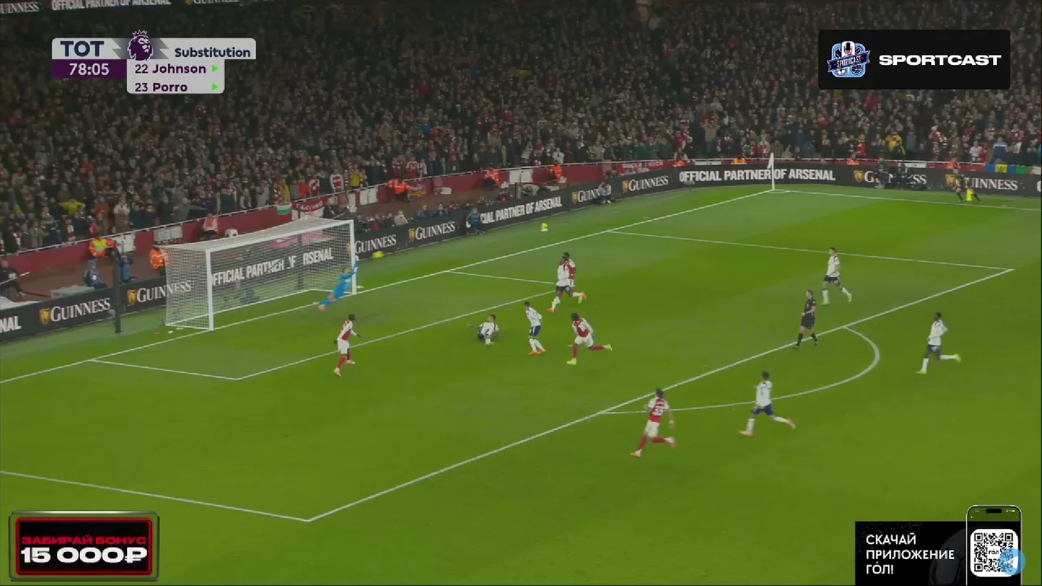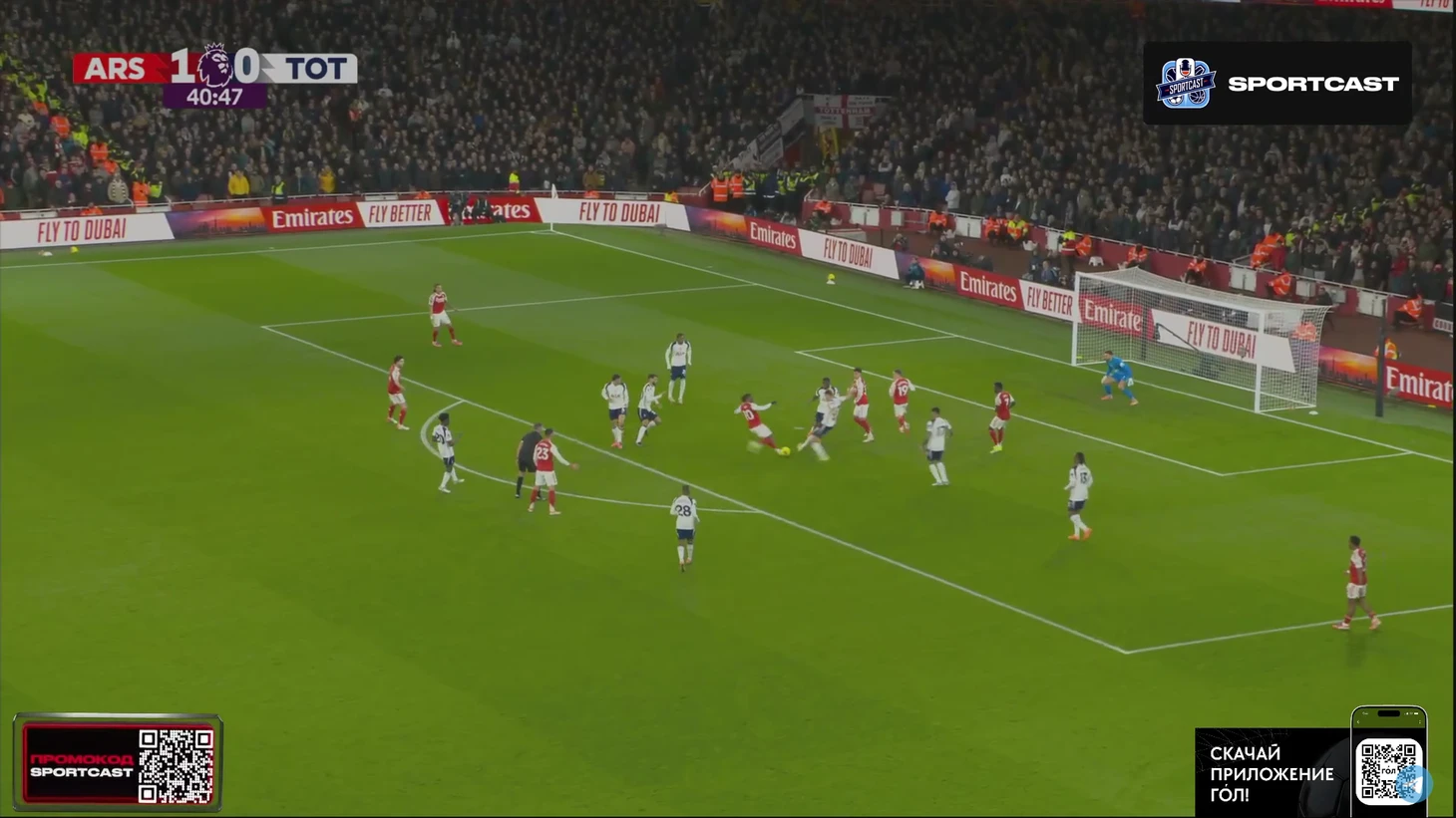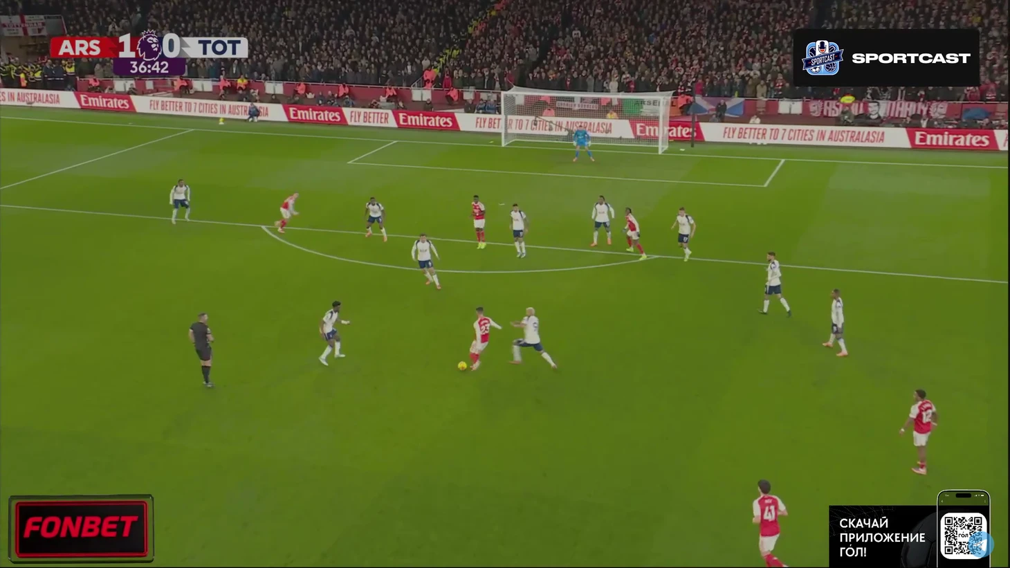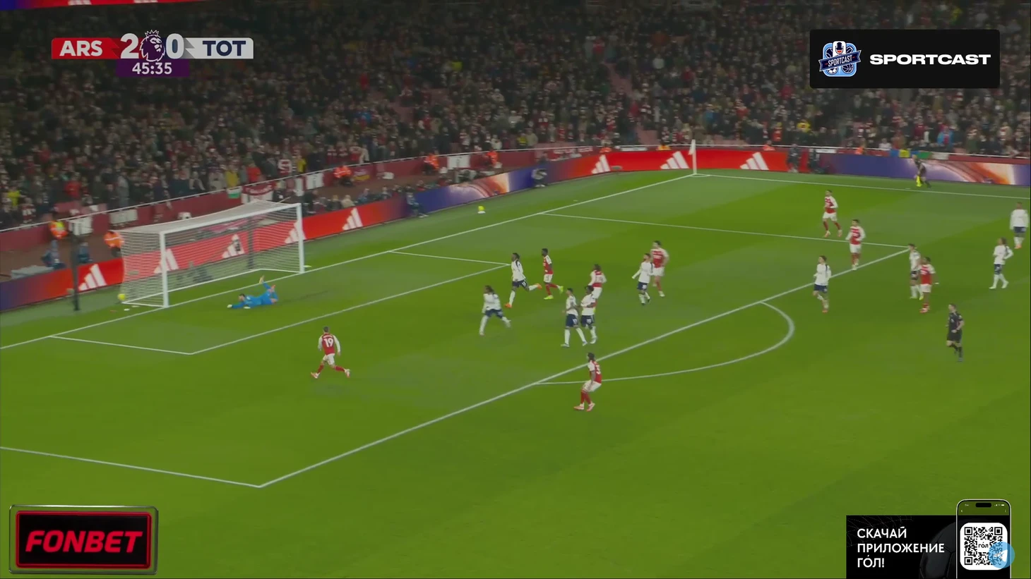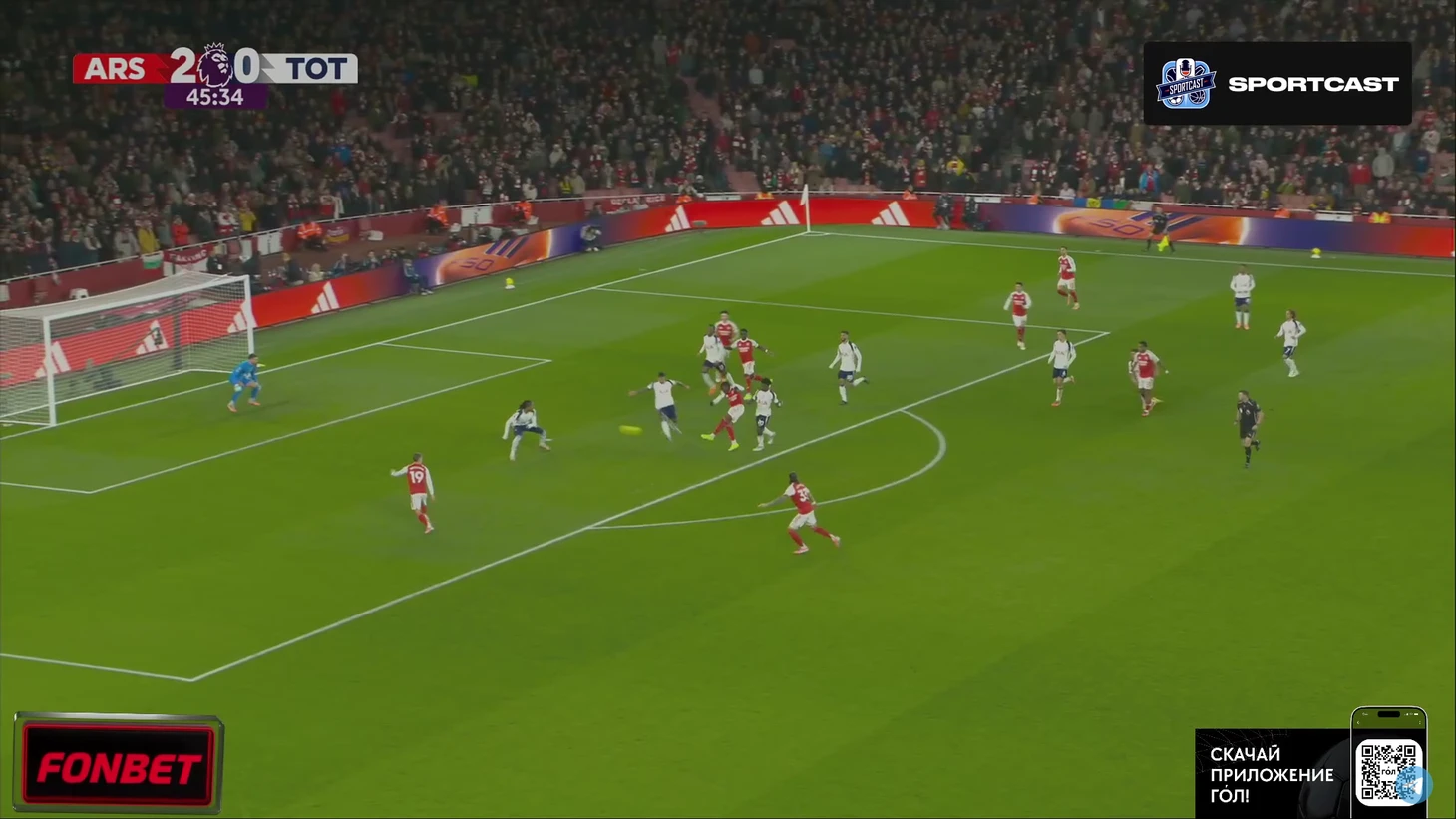 Я подумал, что примерно такой будет вся игра, но ошибся. Долгое время у «пушкарей» не получалось создавать опасность — лишь Букайо Сака два раза пробил со штрафного, но первый удар прошёл мимо створа, а второй получился несильным и лёгким для Викарио. При этом сам «Тоттенхэм» даже не пытался играть в атаку: за весь первый тайм у гостей было 0 ударов по воротам Райи.