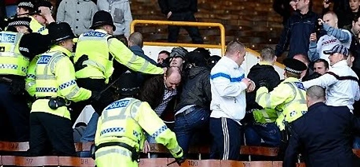 Вскоре полиция была уже там, но Suicide Squad настолько хорошо их знали, что к моменту их приезда спокойно попивали пивко с местными националистами в более знакомом месте у стадиона. Когда выпито было уже достаточно, они вышли на улицу и стали петь песни с националистическим подтекстом. Вскоре к ним подъехала полиция и вряд ли только из-за шума. Город всё-таки был небольшой, и полиция наверняка уже знала, кто бил стекла и громил заведения. Полицейские были в полной экипировке со шлемами и щитами, и как только они все выгрузились из автобусов, в них тут же полетели несколько бутылок, но в итоге ни одна из них даже не долетела. Полицейские сразу же пошли на Suicide Squad в атаку и стали подходить группами с двух сторон, тесня хулиганов к бару. Здесь стоит немного отойти от повествования и сказать о том, что полиция в тот день, после погромов прошлой ночи, была невероятно жестокой. Очень серьезное рассечение получил один из местных депутатов, индус, который просто хотел поговорить с полицейскими. Поэтому неудивительно, что стражи порядка не захотели применять мягкие меры к «отряду самоубийц». Полицейские шли в два ряда – первый прикрывался щитами, а второй, когда они подошли достаточно близко к хулиганам, начал бить щитами сверху по головам. Многие подозревают, что стражи порядка предварительно заточили щиты снизу, потому что кровь тут же потекла ручьями, а многие были серьезно ранены. Тут, однако, полицейские допустили серьезную ошибку – они разозлили Suicide Squad.