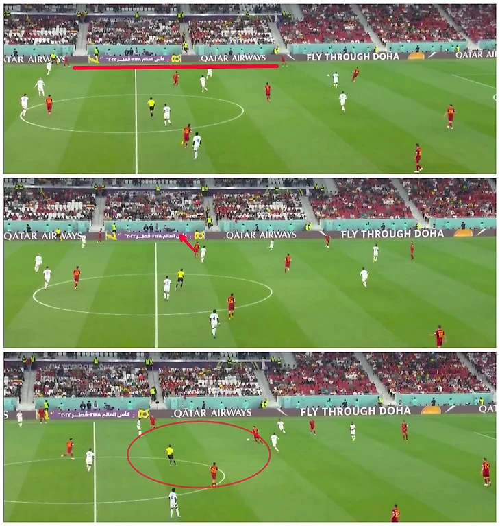 Чтобы решить это нужна глубина команды (расстояние от центрального защитника до центрального нападающего), но Энрике акцент сделал на другом. Крайние защитники сборной Испании оставались в низких позициях при розыгрыше мяча, а вингеры наоборот дисциплинированно держали очень высокие позиции на флангах. В результате получались большие пространства на флангах, куда время от времени выдергивались Гави или Педри, уводя за собой опекающих их футболистов, в результате чего Бускетс, главный дирижёр команды, получал достаточно пространства и времени, чтобы задать атаке верные направление и темп.