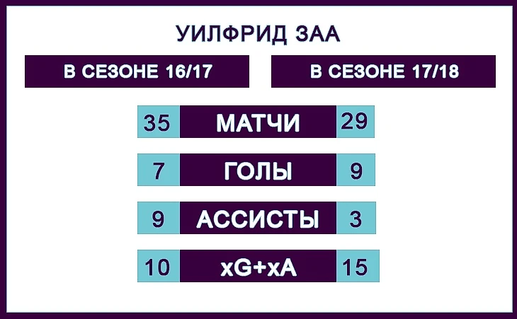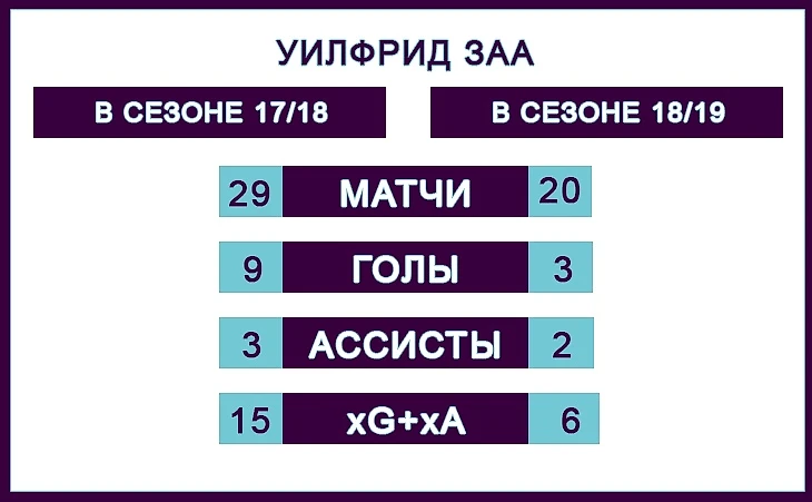 Из статистики видно, что в сезоне 16/17 Заха перебрал по результативным действиям, которых должно было быть на пять меньше. Зато в сезоне 17/18, который чуть хуже по результативным действиям, этих самых действий должно было быть больше, чем в итоге получилось. Неудивительно, что после таких сезонов к Уилфриду приписывали интерес таких клубов как «Челси», «Тоттенхэм» и «Манчестер Сити». Но то ли не сложилось, то ли клубы не сошлись в цене, но Заха остался в «Пэлас», подписал новый контракт до 2023 года и слухи закончились. Но сезон 18/19 складывается не так, как хотелось бы и команде и ему самому. «Кристал Пэлас» идет на 14 месте в чемпионате, иногда обыгрывая «Манчестер Сити» и устраивая трёпку «Ливерпулю», но испытвая трудности в матчах с более слабыми соперниками. Сам же Заа испытывает проблемы с результативными действиями. Справедливости ради, он помогает команде не только ассистами. В этом сезоне он совершил 62 успешные обводки, больше в лиге только у Эдена Азара. А еще заработал на себе два пенальти.