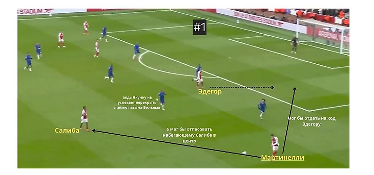 №1. Видно, что принимая мяч, Мартинелли находится в неплохой позиции. Он может либо отдать на ход Эдегору, который грамотно забегал за спину Кукурельи, либо отпасовать прибежавшему поддержать атаку Салиба, так как Нкунку физически не успевал перекрыть линию паса на своего соотечественника из соседнего клуба. Но Габриэль идет в лобовую атаку на испанского левого защитника Челси и глупо теряет мяч.