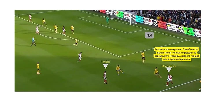 №4. Габриэля накрывает сразу 3 футболиста Вулверхэмптона. Любой футболист, думаю, быстро вернул бы мяч Тимберу и открылся. Но не Габриэль. Мартинелли почему-то пинает мяч в трио «волков» и, конечно, мяч теряет.