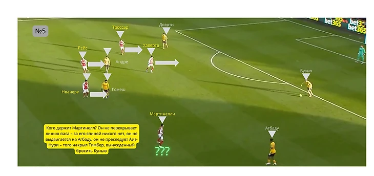 №5. Здесь хочется обратить внимание на отношение Мартинелли к персональной опеке. На самом деле, таких моментов множество, но достаточно посмотреть на 1. Кого держит Мартинелли? Вот кого? Он не держит Агбаду, ближайшего к нему соперника. Он не перекрывает линию паса – за его спиной и близко никого нет, на Буэно или того же Агбаду он не выдвигается. Далеко за ним открывается Аит-Нури, но и за ним он не следует, поэтому за тем вынужден выдвинуться Тимбер (за кадром), которому приходится из-за этого бросить Матеуша Кунью. Видно, что другие игроки лондонцев впереди делают все, как надо – Хавертц пытается перекрыть линию паса на Доэрти и Андре, Троссар присматривает за Доэрти, а Райс – за Андре. Нванери опекает Гомеша. По логике вещей Мартинелли остается закрыть Агбаду, чтобы Буэно пришлось играть в длинный пас, но Габриэль решает просто постоять в полупозиции.