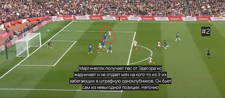 №2. Мартинелли получил пас от своего капитана. Сразу 3 футболиста Арсенала набегало в штрафную Челси второй волной, но Габриэль не поднимает голову, хотя его никто не атакует в этот момент. Он пробивает из очень невыгодной позиции и очевидно мажет.