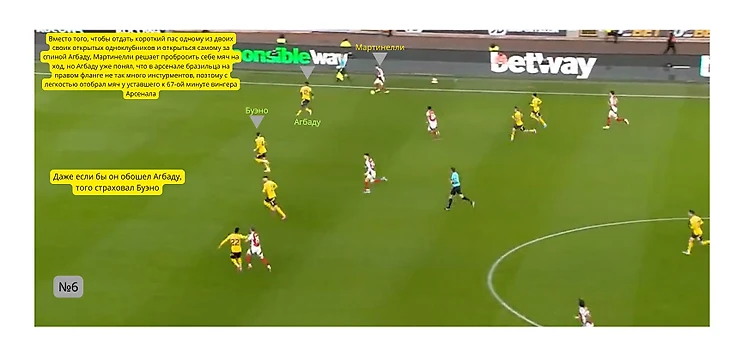 №6. Вместо того, чтобы отдать передачу одному из двоих своих товарищей, а затем открыться за спиной Агбаду и забежать в штрафную, заметно уставший к 67-ой минуте Мартинелли, решает пробросить себе мяч на ход, явно преувеличивая свои возможности, и недооценивая скорость Агбаду. Но тот уже изучил весь скудный инструментарий правофлангового Мартинелли, и с легкостью отобрал мяч. Главное, даже если бы Мартинелли и прошел бы каким-то чудом защитника Вулвз, то сразу же пришлось и Буэно проходить, ведь он страховал напарника.