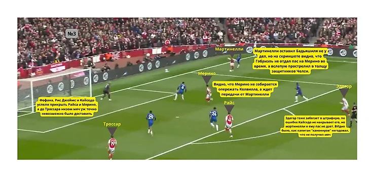 №3. Секундой ранее Мартинелли сыграл просто блестяще! Да-да – он оставил Бенуа Бадьяшиля не у дел. Но здесь напрашивается пас на Микеля Мерино, а бразилец почему-то игнорирует его и вслепую простреливает в толщу защитников в синих футболках. Хотя, повторюсь, Мерино не собирался играть на опережение с Колвиллом, а ждал паса в более раннем эпизоде от Мартинелли. Да и Эдегор забегает в штрафную, Кайседо по ошибке его бросает, но Мартинелли и его мячом не наградил. После этого видно, как норвежец негодует запоротым моментом. Фофана, Кайседо и Рис Джеймс не успели прикрыть Мерино и Райса. А до Леандро Троссара, так вообще, мяч невозможно было низом доставить. Но Габриэль видимо был иного мнения.