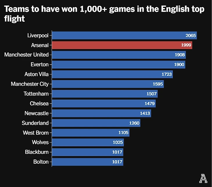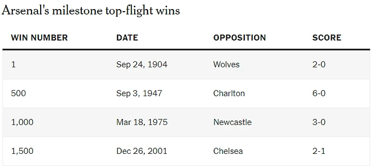 «Арсеналу» потребовался почти 71 год, чтобы одержать свою 1000—ю победу (11 сезонов были отменены из-за двух мировых войн) - со счетом 3 - 0 над «Ньюкаслом» в марте 1975 года под руководством Берти Ми. Сорок девять лет спустя «Арсенал» находится на пороге 2000-й победы в английской вышке.