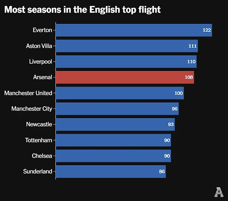 Несмотря на то, что «Арсенал» выиграл на семь титулов меньше, чем «Манчестер Юнайтед» (13 против 20), «Арсенал» выиграл на 91 матч больше, чем «Юнайтед» в высшем дивизионе, — во многом благодаря тому, что они сыграли на 356 матчей больше в топ-лиге.