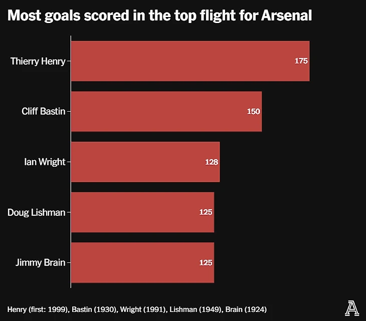 Анри и Райт - единственные из этой пятерки, кто становился лучшим бомбардиром сезона в высшем дивизионе Англии. Анри добивался этого четыре раза (2001/02, 2003/04, 2004/05 и 2005/06). Только Джимми Гривз (шесть) и Стив Блумер (пять) чаще становились лучшими бомбардирами в высшем дивизионе Англии. Последний сезон Гривза, в котором он возглавил чарты, был за «Тоттенхэм» в 1968-69 годах, а Блумера - в сезоне 1903/04 за «Дерби Каунти».